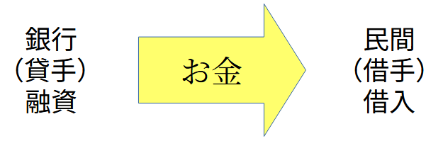 ちなみに融資は貸す側のお金の移動で、借り入れは借りる側のお金の移動で、同じお金を指す。