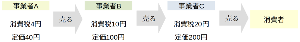 この関係だと事業者Bの仕入れにかかった消費税は4円、以降これを仕入れ税とする。