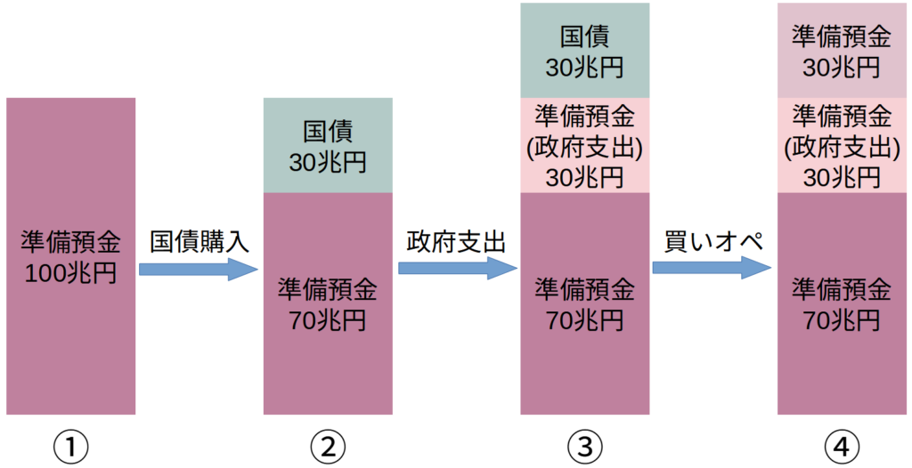①全市中銀行の日銀当座預金残高が100兆円あって30兆円国債を買います。